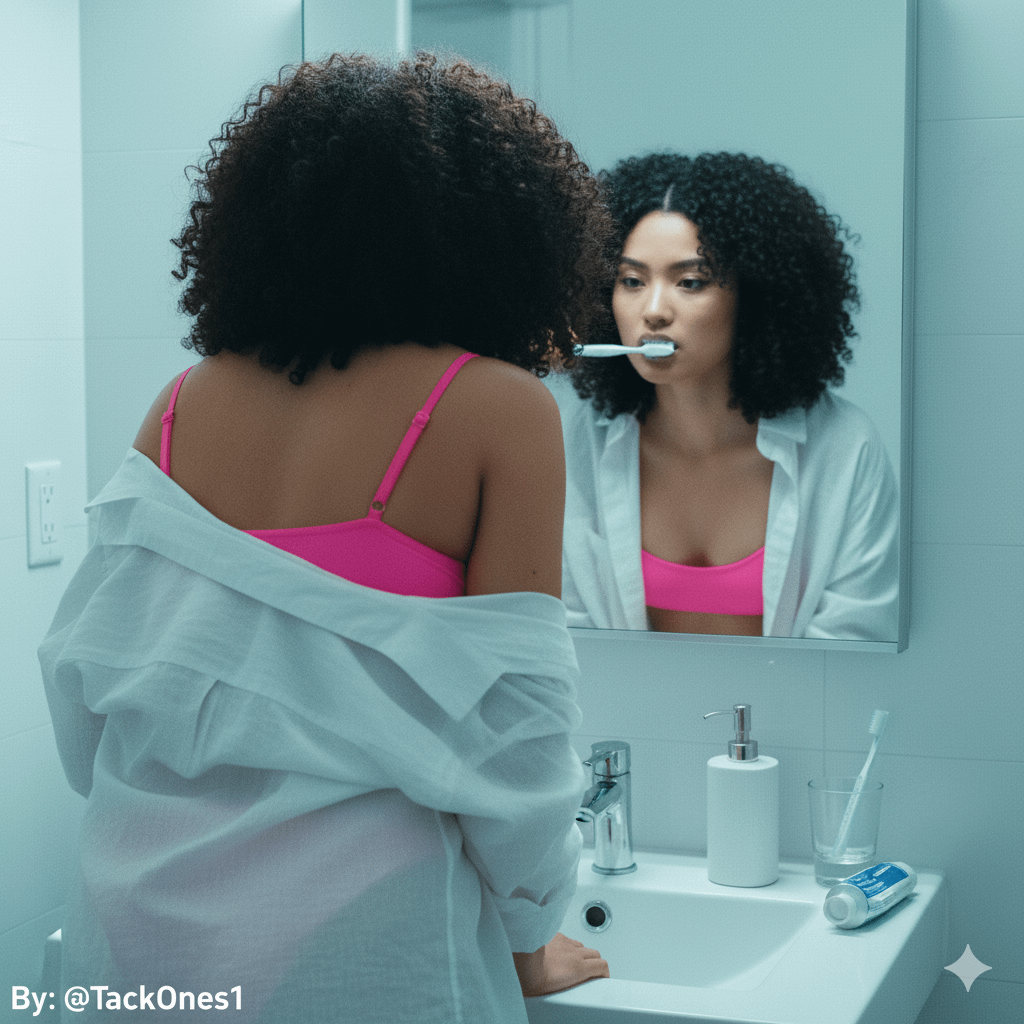Generate an image with my photo, Don't change my face or my features, make it look real and natural, my photo integrates naturally into the environment that I describe below: The image, with a general bluish or cyan tone, focuses on the back of a woman who is leaning towards a bathroom sink, with her back to the viewer. She wears a loose-fitting white shirt that reveals a bright pink two-piece swimsuit underneath. In the background, a rectangular mirror reflects the woman's face and upper body. In the reflection, she is seen brushing her teeth, with a brush in her mouth and a diffuse expression of concentration. The light appears to come from a front or overhead source, creating a backlighting effect on the foreground figure and clearer illumination in the reflection. A soap or lotion dispenser and a toothbrush can be seen on the edge of the sink. The composition of the image is voyeuristic and intimate, capturing an everyday and personal moment in a bathroom. The focus is sharply on the woman's backside, while the reflection in the mirror, although blurry, provides context about the activity she is engaging in. Cold tones predominate in the color palette, giving the image a slightly melancholic or calm atmosphere. The image suggests a private moment captured, with an interest in the shape of the female body and daily routine.