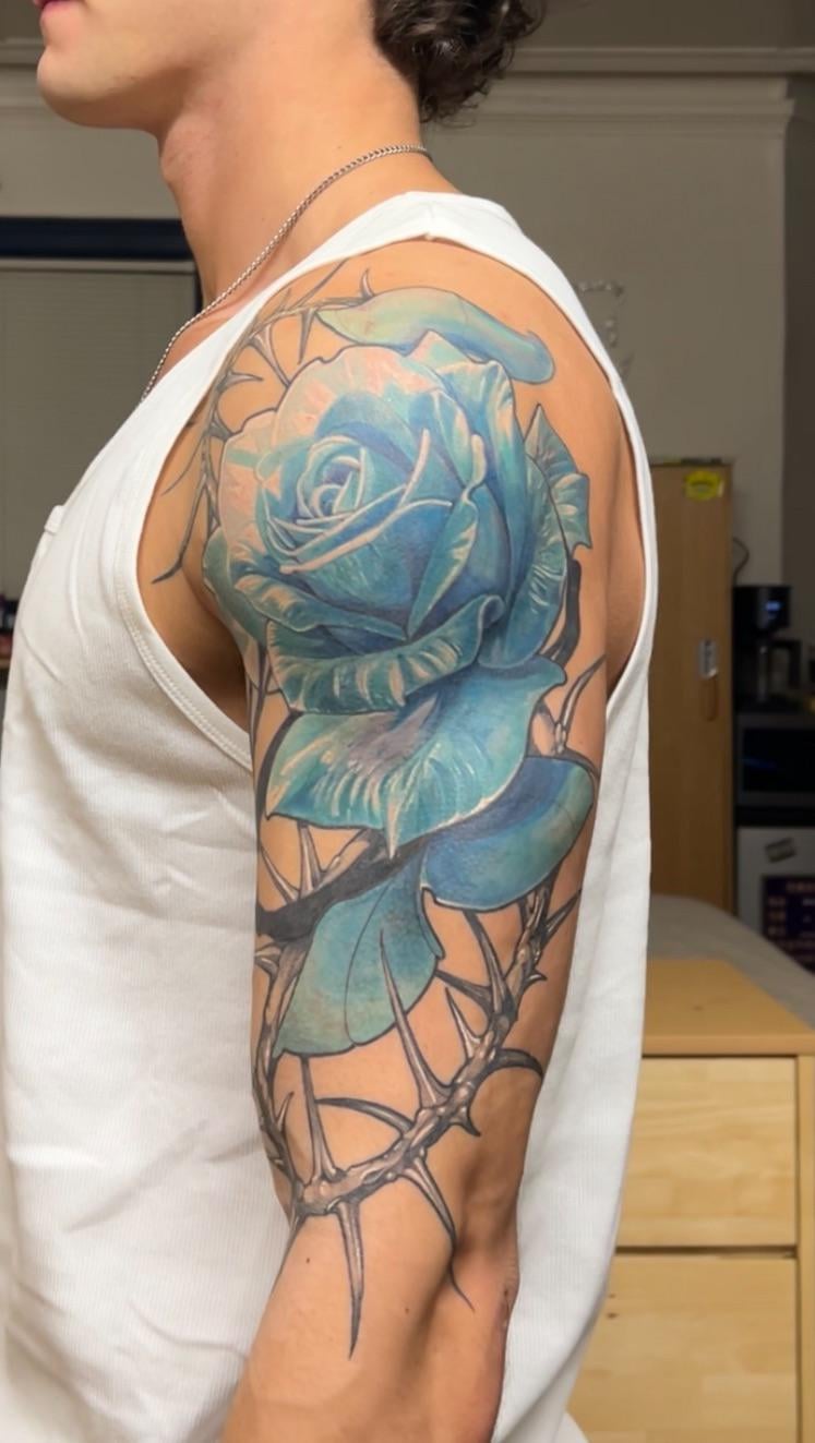 I was so set on the idea of a blue rose and knew I wanted to eventually work towards a sleeve so I trusted him and went with what he made. It looked beautiful and I decided to go with it and “go big or go home.” I got it in September and I liked it initially but for the last month I’ve been filled with so much regret, everyday I hate it.