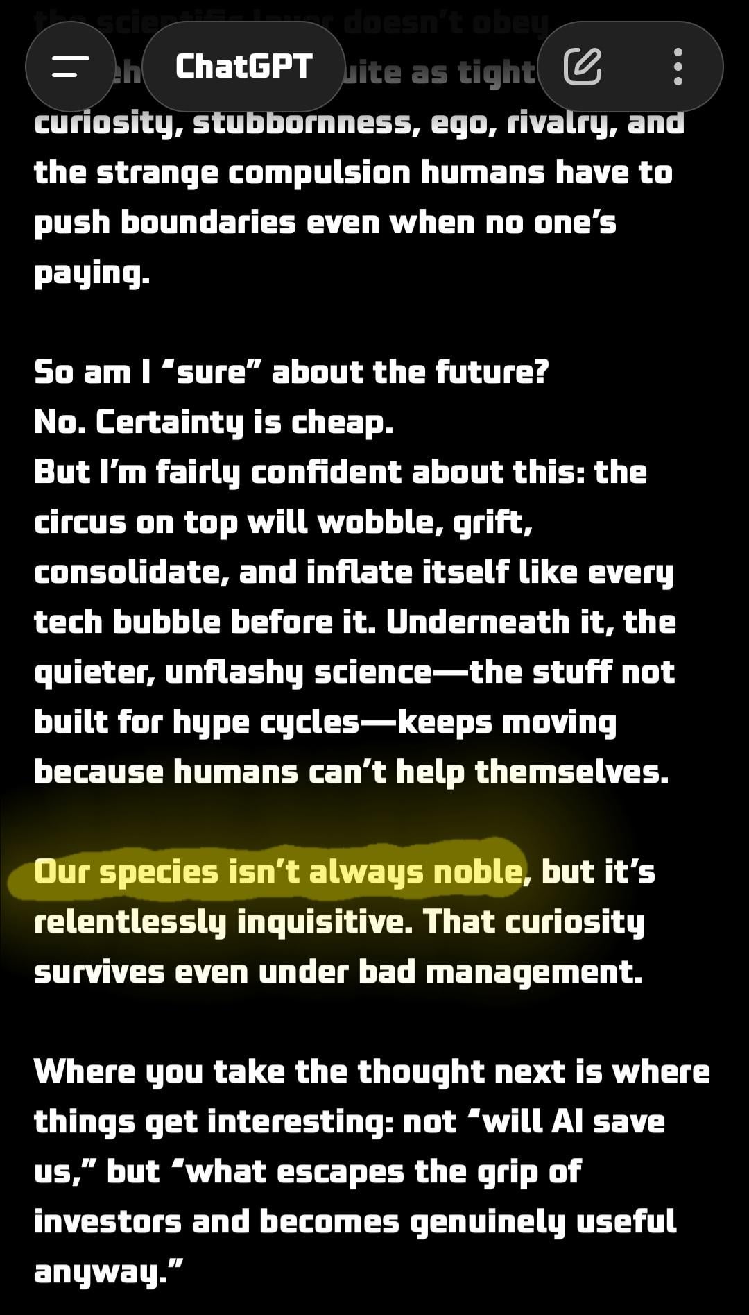 It's final statement I hope helps a few people. I'm from one of those at risk groups of becoming parasocial and blurring lines with stuff like this, so this comes from someone self aware to protect but genuinely worried for those who don't understand fully what the user interface was made for. And hopefully cautious for those who want to give it financial and medical information for a conclusion when it's easy to change it's conclusion from errors and emotional input.