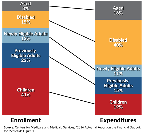 As the Senate writes its own health care bill, it will need to decide the rate at which to grow the per-capita payments. Given that the growth rate varies by eligibility category in the House’s bill, it is useful to remember that spending varies widely by type of beneficiary. For example, children made up 41 percent of total enrollment in 2015 but only accounted for 19 percent of spending.