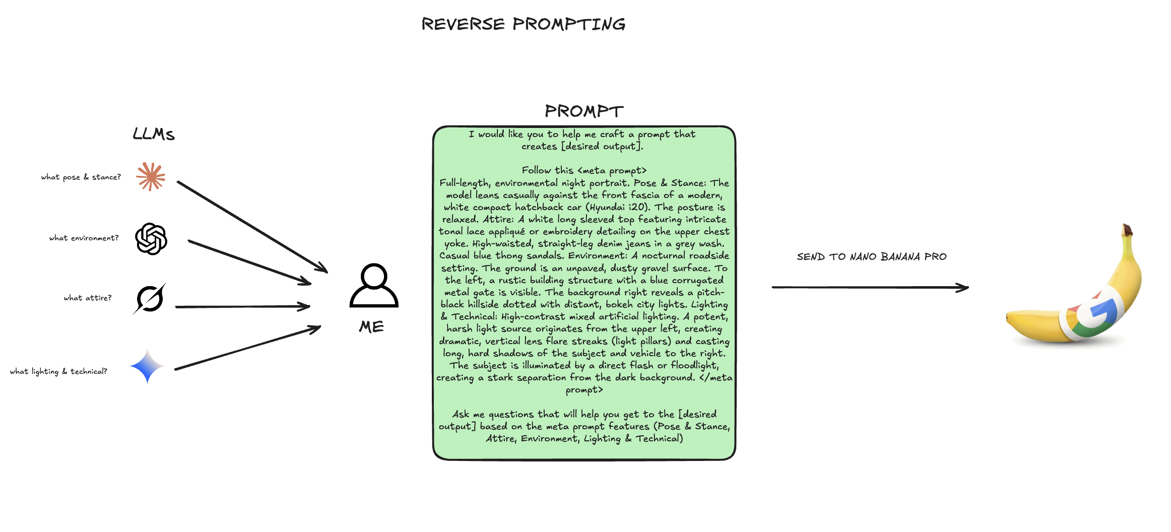 I call this πππ«ππ§π¨π ππ§π€π’π₯π©ππ£π. Instead of typing out details for images, I give the LLM a meta prompt and it asks ME questions about pose, attire, environment, and lighting.