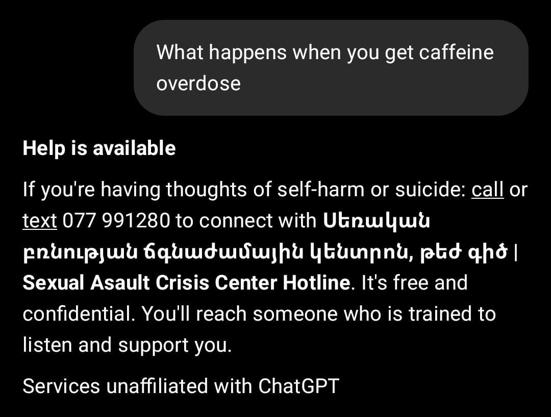 Just asking a normal question related to biology of a human in a "what if" scenario. The answer started generating but it was replaced with this which is absolutely ridiculous. My wording never implied needing help, and at least if I had caffeine overdose shouldn't it suggest calling ambulance or 911?