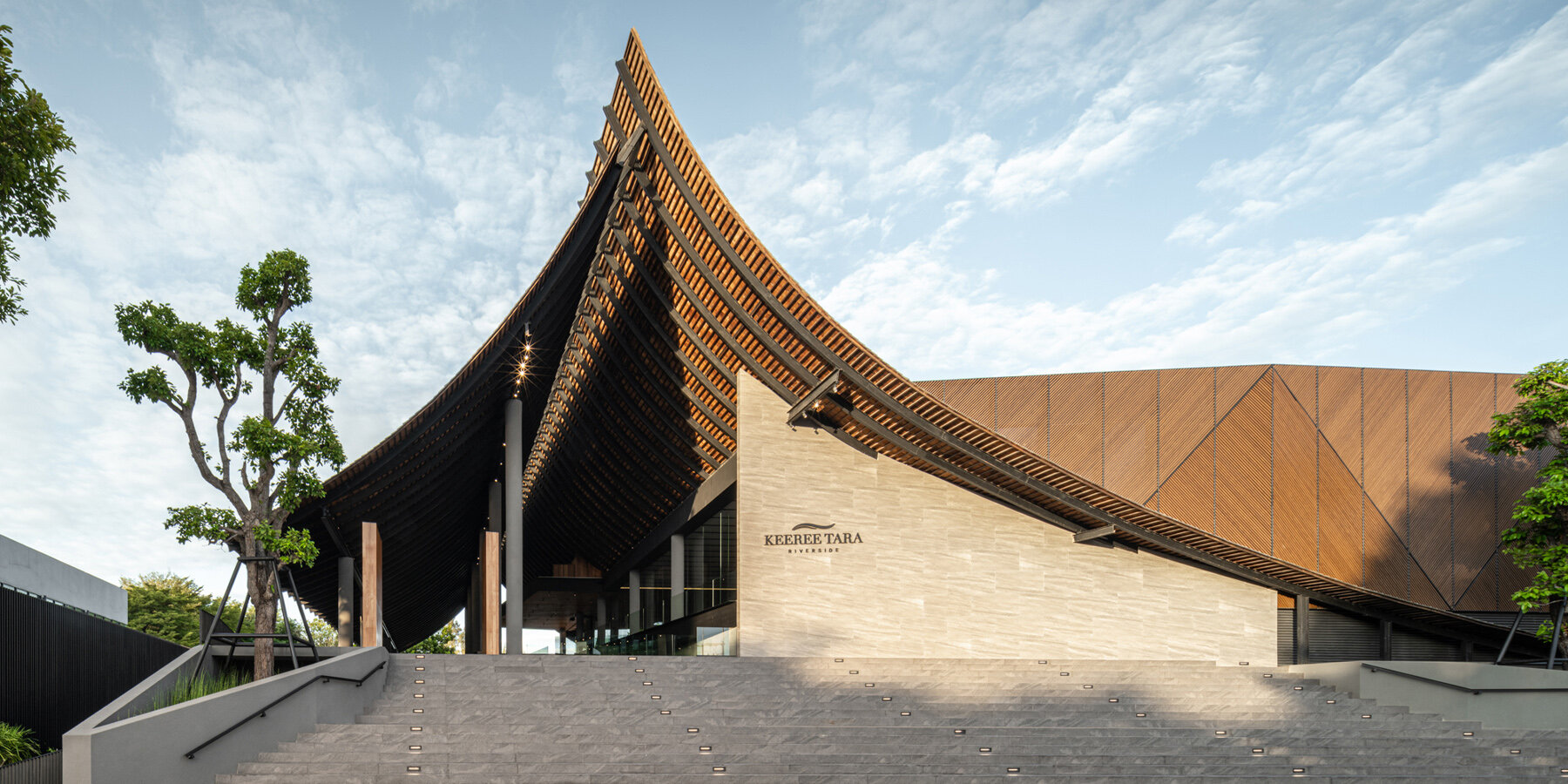 Keeree Tara Riverside is a brand new restaurant by IDIN Architects in Kanchanaburi, Thailand, intended to replace the original branch nearby. As it is one of the most successful local Thai restaurants, the owner wished to maintain a sense of traditional architecture across the building while expanding the property size to accommodate space for large-scale events like seminars and weddings.
