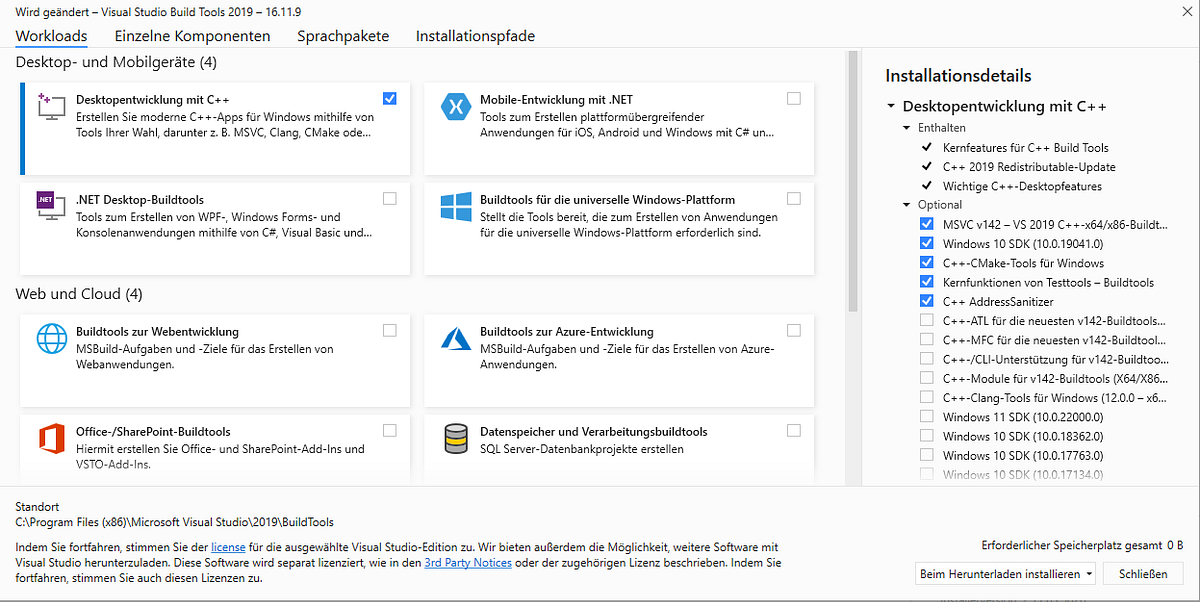 Install part of the Visual C++ build tools: Download and install https://visualstudio.microsoft.com/visual-cpp-build-tools/