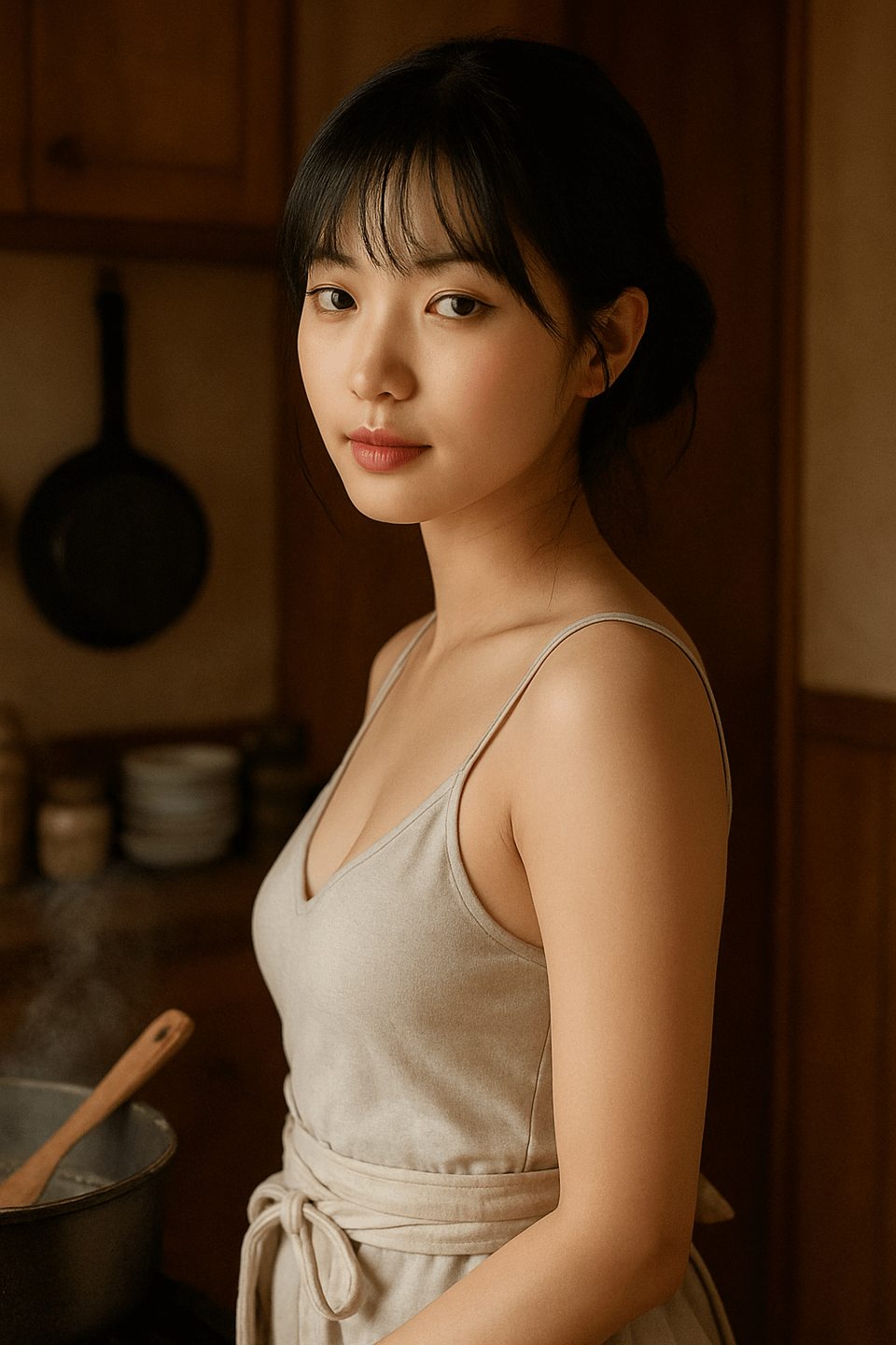 "atmosphere": "Warm, intimate, slightly suggestive/ambiguous, like a gentle moment of cooking at home",
