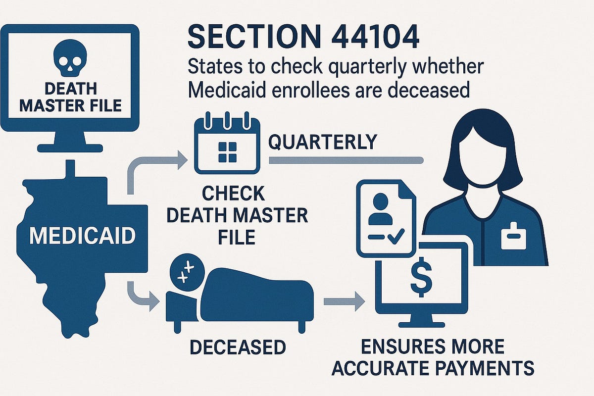 The Bottom line. Section 44104 turns death-record reconciliation from a sporadic housekeeping task into a calendar-driven, system-wide requirement. When the state updates its rolls every quarter, your organization receives more precise eligibility data, fewer recoupment letters, and a smoother revenue cycle.