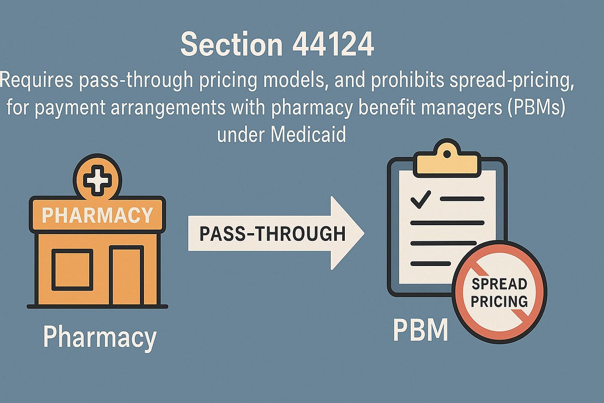 The ground rules that govern how state Medicaid agencies may pay pharmacy benefit managers, or PBMs, require a pass-through model and prohibit the practice commonly known as spread pricing. When federal law uses the term pass-through, it means the state (or its managed-care contractor) reimburses the PBM for the exact amount the PBM paid the dispensing pharmacy for a covered outpatient drug and then adds a clearly stated administrative fee. Spread pricing, in contrast, allows a PBM to bill the health plan one figure, pay the pharmacy a smaller one, and retain the difference as profit. CMS first warned that unchecked spreads were inflating Medicaid drug costs in 2019, issuing a State Medicaid Director letter that urged plans to monitor the gap and consider contract language to curb it. Section 44124 goes far beyond gentle advice: it flatly bans spreads and requires every Medicaid PBM arrangement, whether carved into managed care or retained in fee-for-service, to run on pass-through terms.