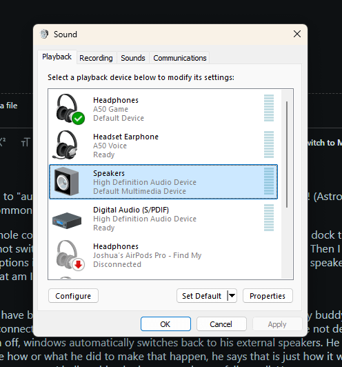This is an issue I have been revisiting from time to time for about a year now. My buddys computer auto connects to his astros when he turns them on and when they are not detected or he turns them off, windows automatically switches back to his external speakers. He tells me he is not sure how or what he did to make that happen, he says that is just how it was when he got the computer. I believe him, he is not a tech savy fella at all. He owns an iBuyPower prebuilt from Best Buy.