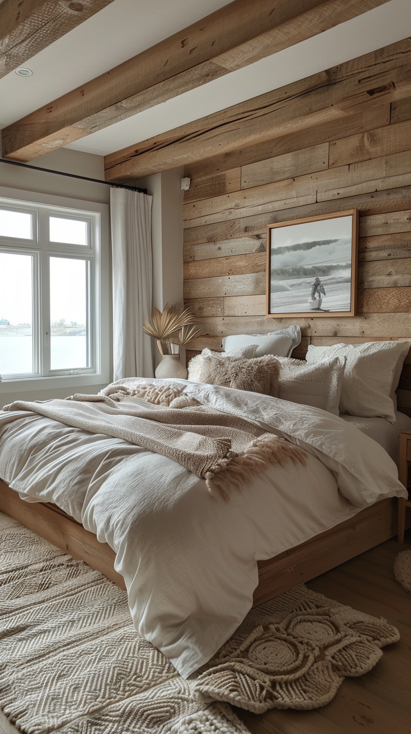 Opt for bedding with simple patterns or solid colors that complement the neutral palette of the room. High-quality linens in soft textures contribute to a serene and comfortable environment.