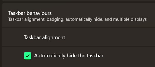 I have workflows that require the taskbar to be hidden at times, and a custom app I'm developing that needs it to be shown. I'm having to switch back and forth on this setting quite frequently, and want a way to not keep the settings app open all the time.
