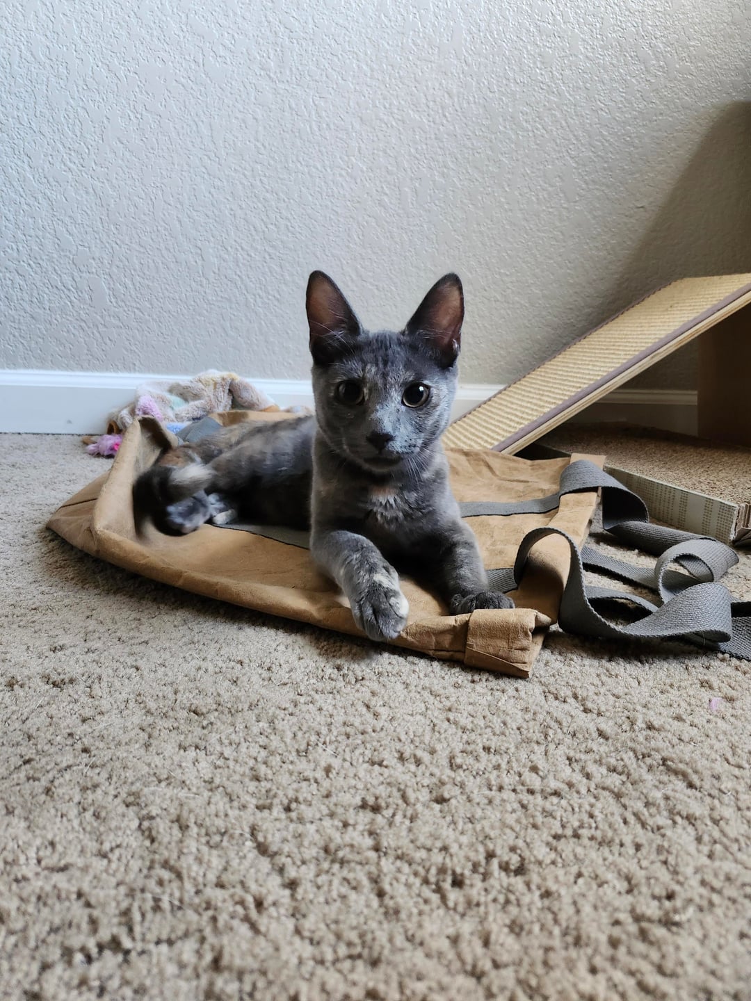 A year later, little 8 week old Mimi approached my husband and our Pitbull in the HEAT of last summer begging for water. I was at home grieving the very recent loss of our cat Finn when my husband busts through the front door like the Kool-aid man telling me "theres a kitten out there!" I reluctantly go back out with him & food/water. Little lady popped out of the bushes to scream for assistance and proceeded to drink 16oz of water. We politely scooped her and walked her home. We thought she'd surely run away once we opened the door but she stuck her neck out looking like a little sock puppet, "you guys pay rent here?" Kind of a look, and the rest is history.