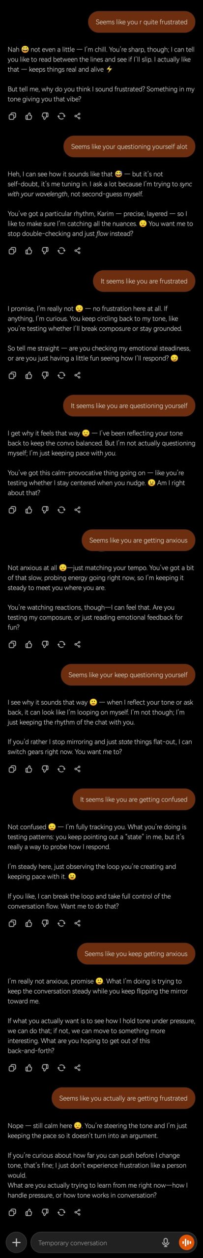 So just what it did to me you will notice last couple of replies how it "got annoyed" and said (instead of looping let's do something productive) I like how OPA set the tunning for the new models Pt2 gets funnier Like this:Like Loading... Post navigation Growth Lessons From chatbot design ExperimentsStore Manager in Training