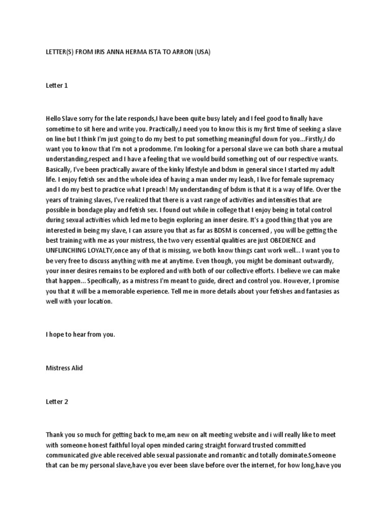 The letters discuss a potential mistress/slave relationship between the writer, Mistress Alid, and the recipient. Mistress Alid outlines her expectations if they were to enter such a relationship, including obedience, loyalty, and following her rules. She requests that the recipient purchase BDSM equipment and have it delivered in order to prove his commitment before their first session. Payment details are provided for acquiring the required items.