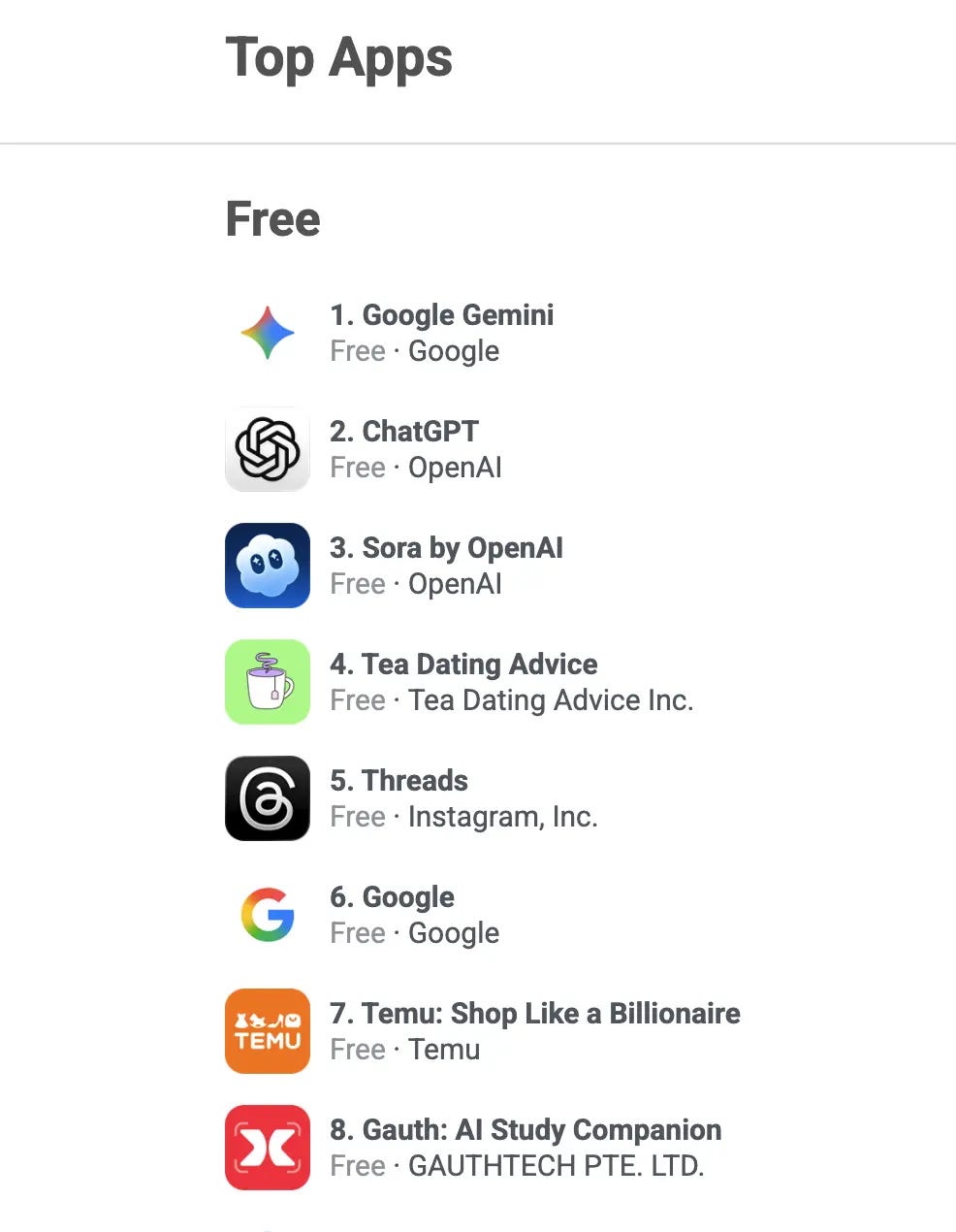 The ranking tells an interesting story. By day two, Sora hit №3 overall. ChatGPT once claimed the top spot immediately, while Grok peaked at №4, Gemini at №6, and Copilot lagged at №19.