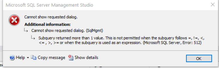 SQL Managed Instance database properties window getting “Subquery returned more than 1 value” error message