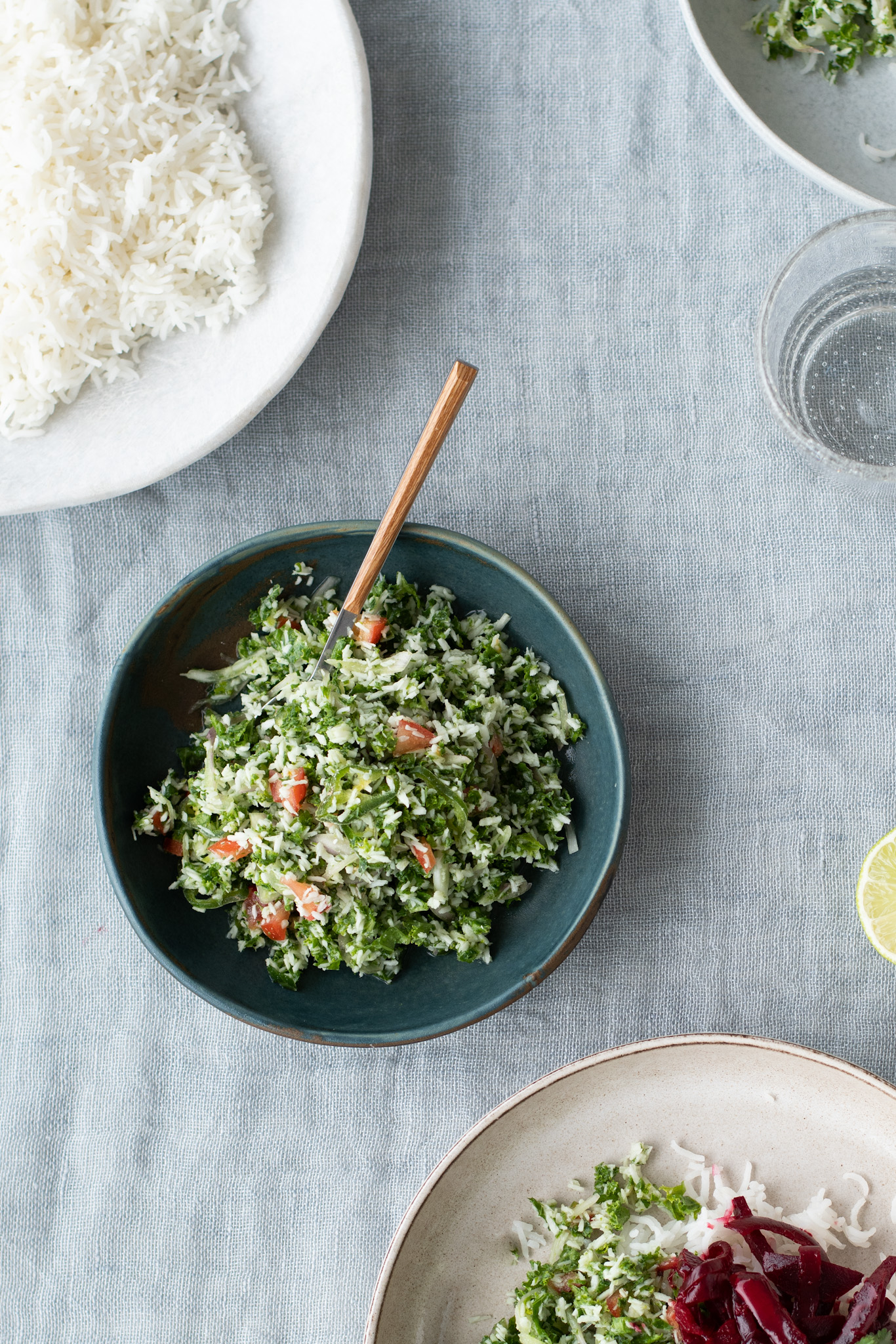 This is the perfect accompaniment to a Sri Lankan curry, the fresh zingy flavours work incredibly well with any rich and spicy dish but especially good with the earthiness of beetroot. Gotu kola is in fact Indian pennywort. A herbaceous perennial plant, native to Asia available to buy online however I have substituted it with curly kale. Traditionally this salad is made with fresh coconut, which I often struggle to find in food stores. I’ve used unsweetened desiccated coconut and rehydrated it as an alternative.