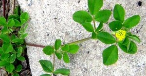 Medicks such as bur medick (Medicago nigra), spotted bur medick (Medicago arabica) and black medick (Medicago lupulina) also have their central leaflet on an even longer stalk than the other two leaflets.