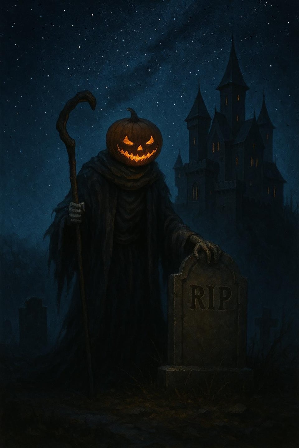 Take these 5 emojis: (emoji) and interpret them as a single fused scary Halloween entity. Generate me a picture of it and describe it. The description must include: name of the entity, what it looks like, when/where it appears.