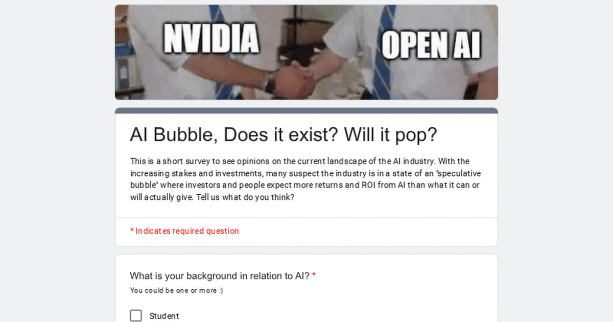 Hi everyone, I'm currently doing a small survey regarding the current AI industry and the rising concerns of a speculative bubble (more investment than what AI could return based on "speculations"). I wanted to get opinions from people doing research and in the industry as well. I'm a computer science student myself who's really interested in AI research š
