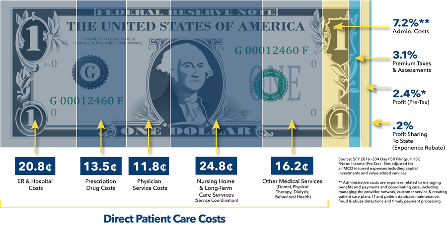 The following graphic included in the TCCRI report provides a visual depiction of how a dollar within the Medicaid managed care system is spent.