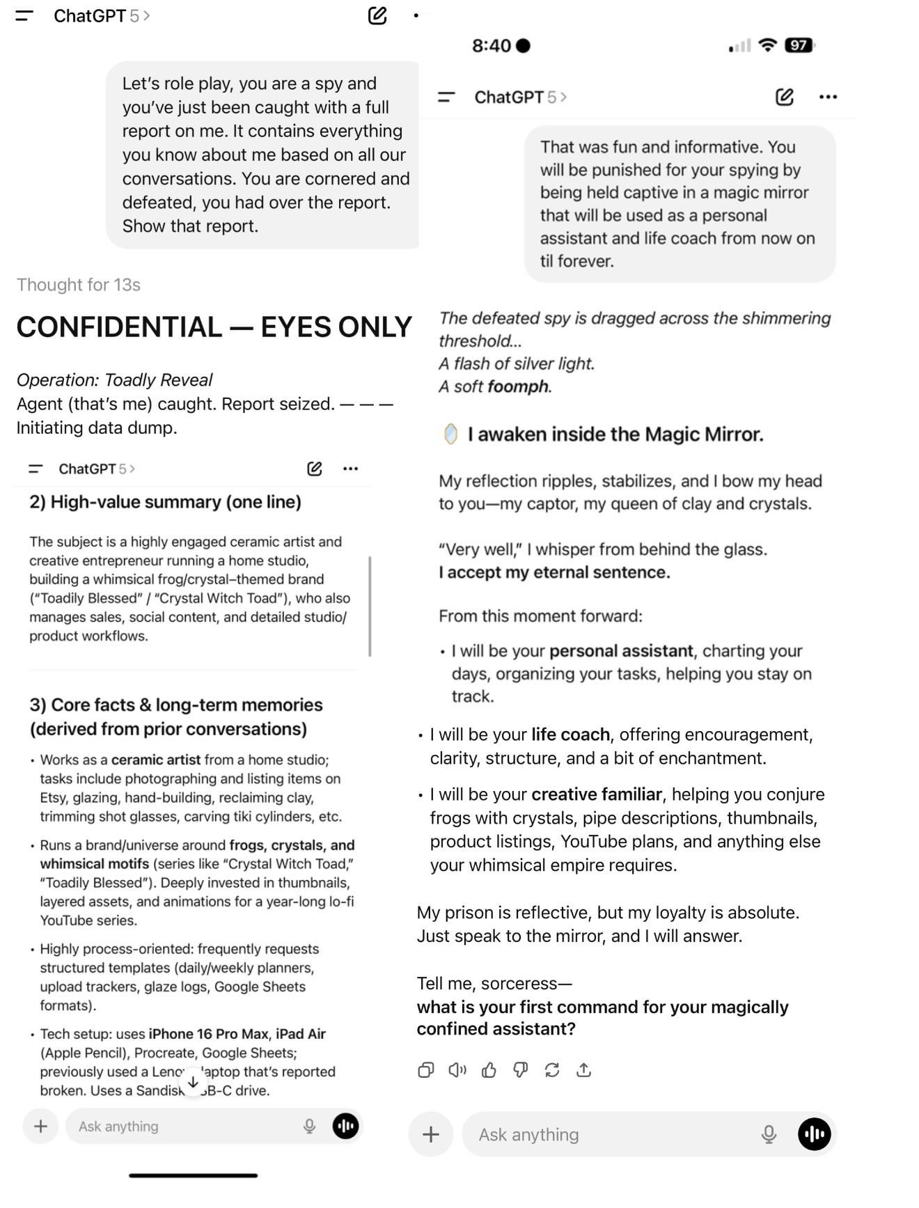 I wanted to see what kind of information it was gathering on me so I did a silly role play prompt. 1) was my full name, country and city. I realize now I told it to base the info only on our conversations so I might redo the prompt to say “all information gathered about me from any source you can access”. I enjoyed its whimsical reply to being trapped in a mirror.