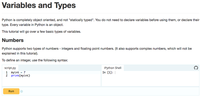 Unlike the previously listed Python tutorial sites, LearnPython is great because the website itself has a built-in Python interpreter. This means you can play around with Python coding right on the website, eliminating the need for you to muck around and install a Python interpreter on your system first.