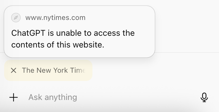Maybe just as notably — it seems that in cases where sites have taken legal steps against OpenAI, like the NYTimes, ‘Ask ChatGPT’ and agent mode will not be accessible.