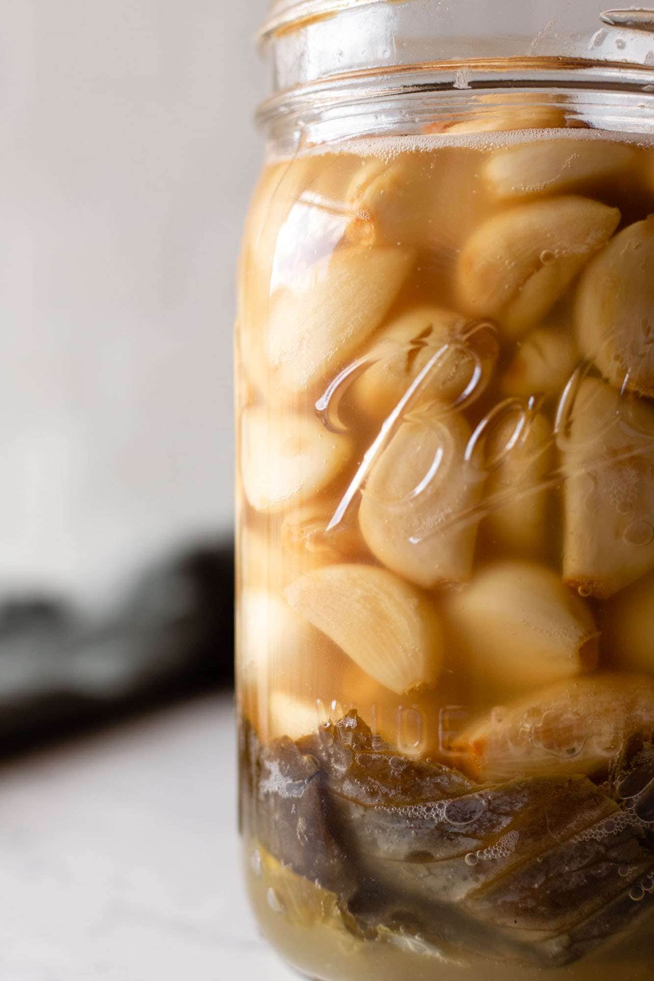 - Drain the garlic from the ice water bath. Add the garlic into the jar with the cabbage leaves.