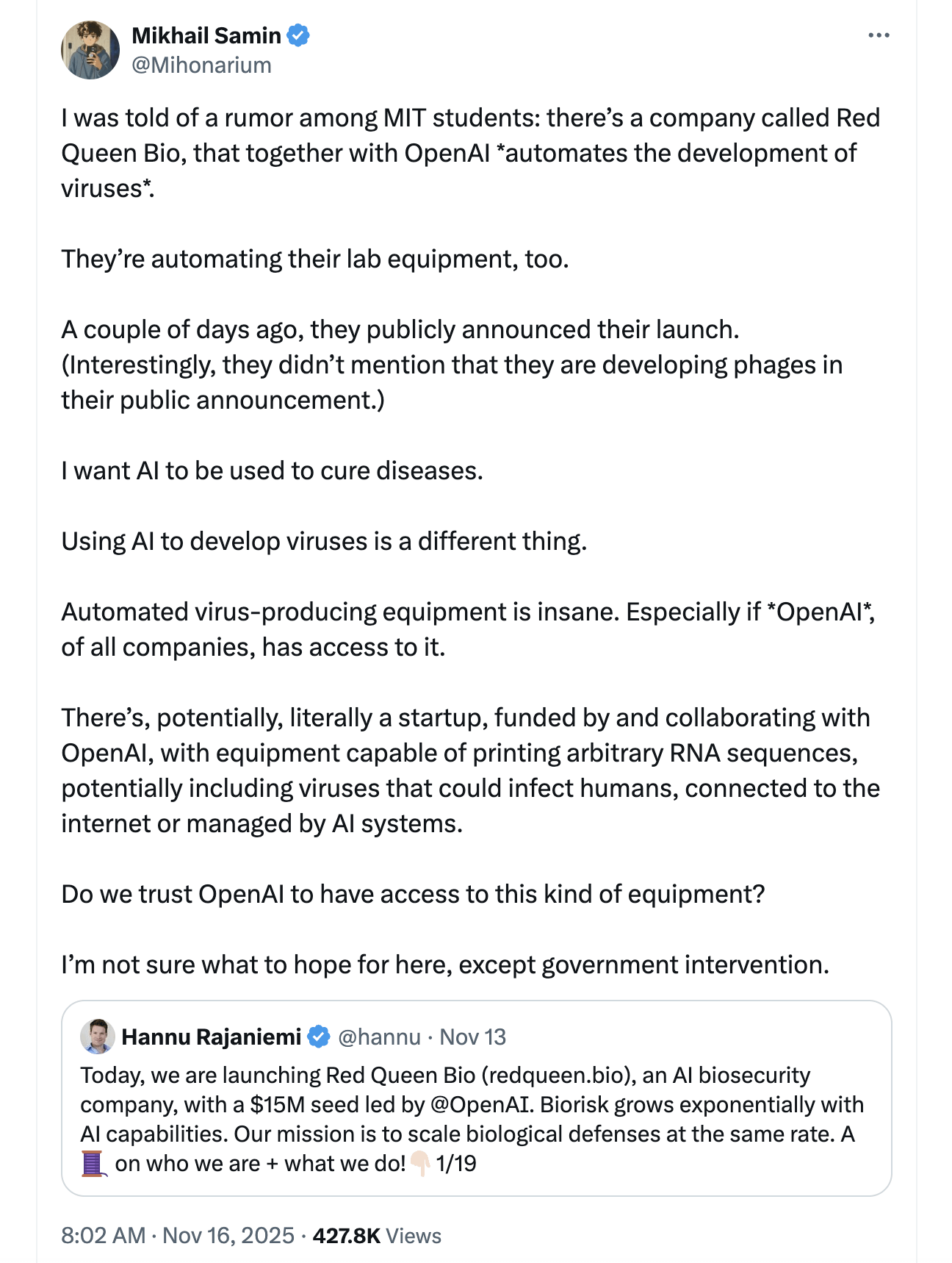 The rumors were true: “OpenAI is automating the development of viruses.” … “I want AI to cure diseases. Automated virus-producing is insane.”