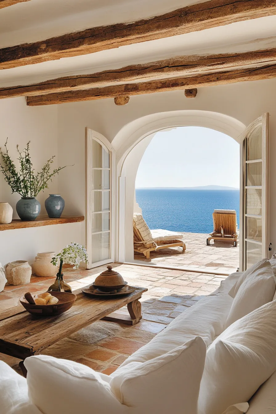 Mediterranean inspired space with arched doorways, exposed beams, rustic decor, and coastal color paletteMediterranean inspired space with arched doorways, exposed beams, rustic decor, and coastal color palette