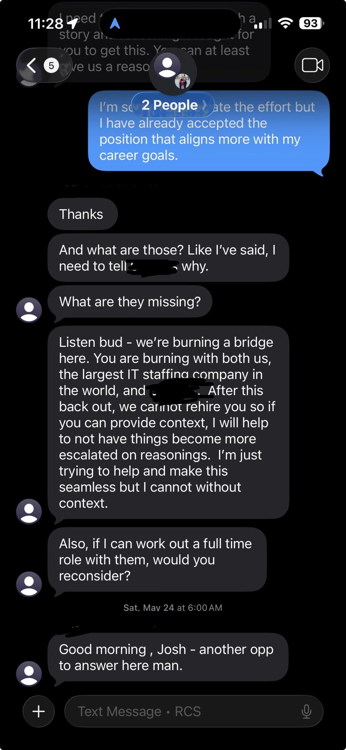 I told them it had better pay, more stability and wasn’t contracting, and I got a bunch of texts from them trying to scare me into staying. Feel like I dodged a bullet not joining them.