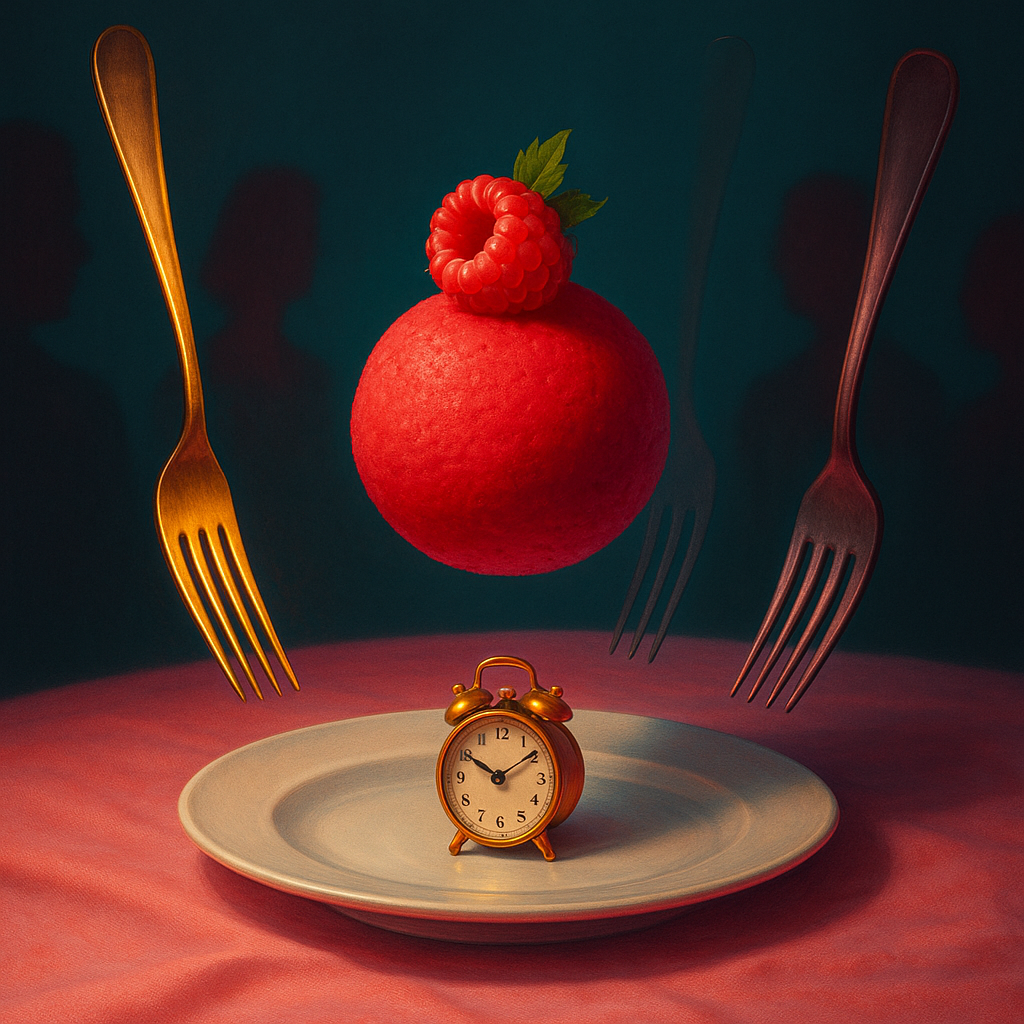 Three-Bite Rule TikTok — Surreal Dessert and Forks Artwork.