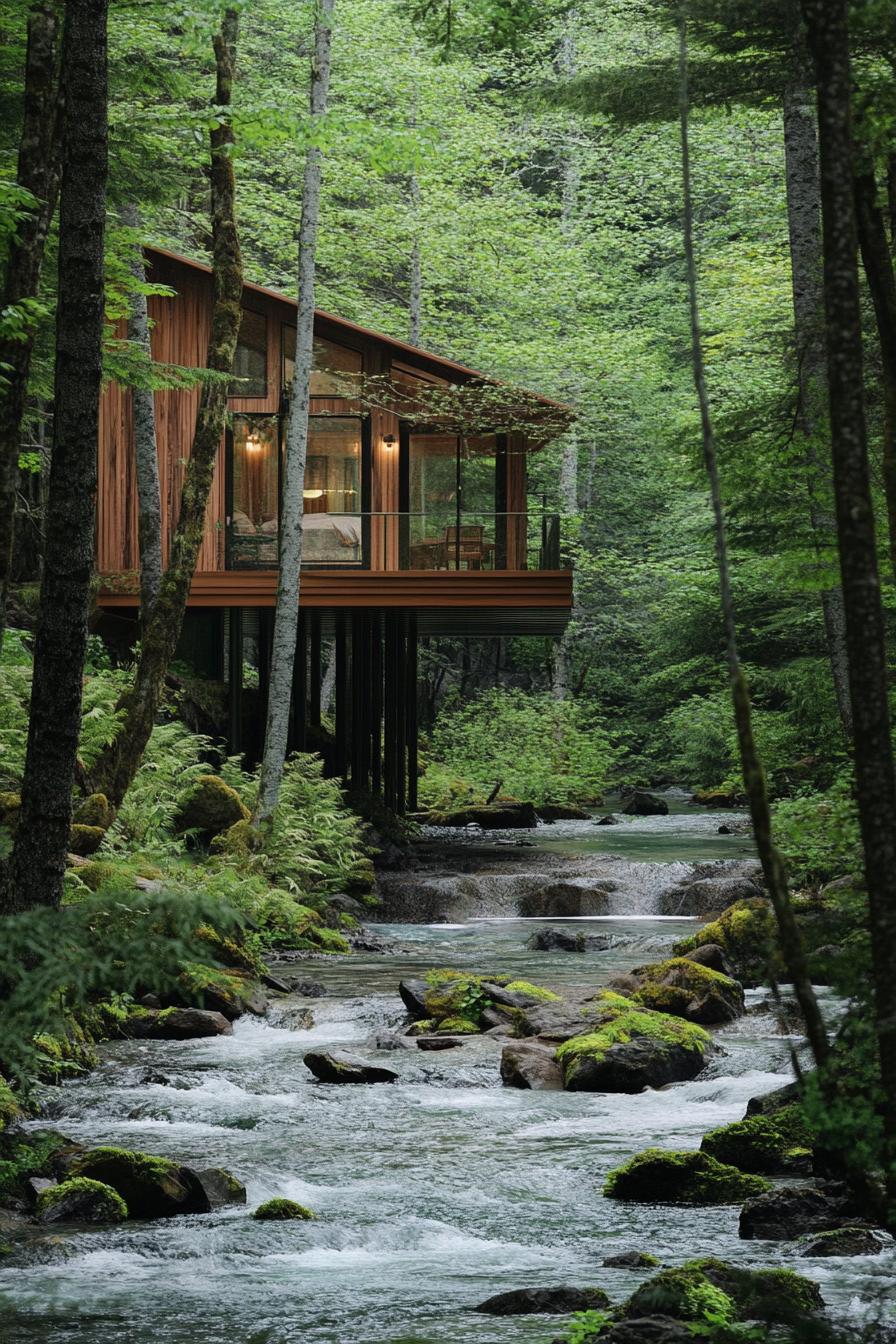 floating cabin house above forest stream in the woods with lush forest views 3floating cabin house above forest stream in the woods with lush forest views 3