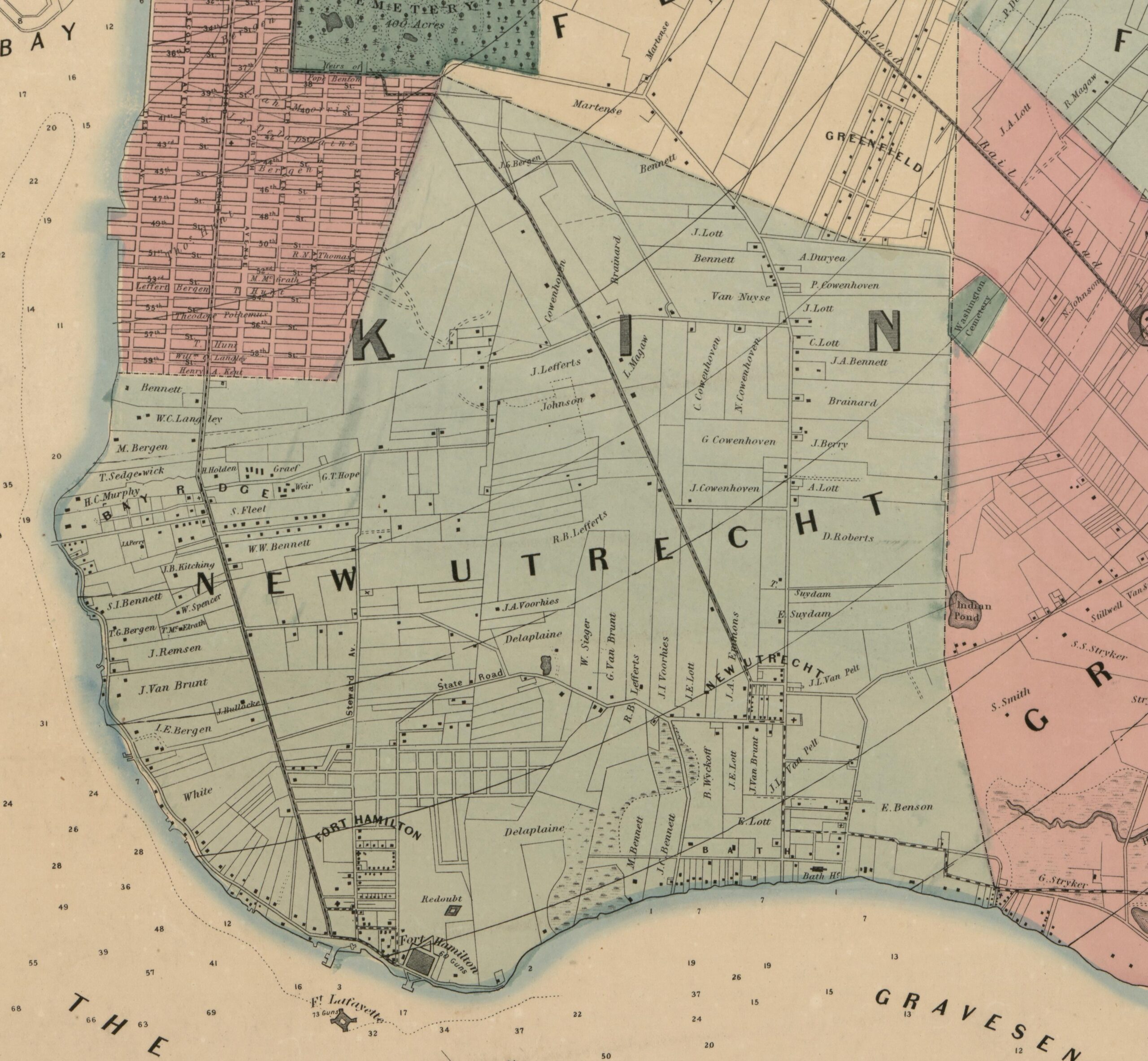 • Speaking of the border of Gravesend and New Utrecht, today that border is Bay Parkway (or 22nd avenue as it was originally known). You can find that border (by the color change on the map, but also) by seeing the The Indian Pond in the right-hand portion of the map. It sits on the dividing line between the towns of New Utrecht and Gravesend. The pond was drained at the beginning of the 20th Century and eventually turned into Seth Low Park, sitting roughly between 73rd and 75th streets. Beyond the color of this map, if you’re in the area, you can tell the difference in towns because the grid changes. Gravesend’s streets run east-west (as in West 12th street), and its avenues are lettered. Today the next avenue running northeast-southwest south of Bay Parkway and 72nd street is Avenue O, which means if you’re standing on Bay Parkway you’re technically in Bensonhurst/New Utrecht… if you walk into the park, you’re technically in Gravesend.