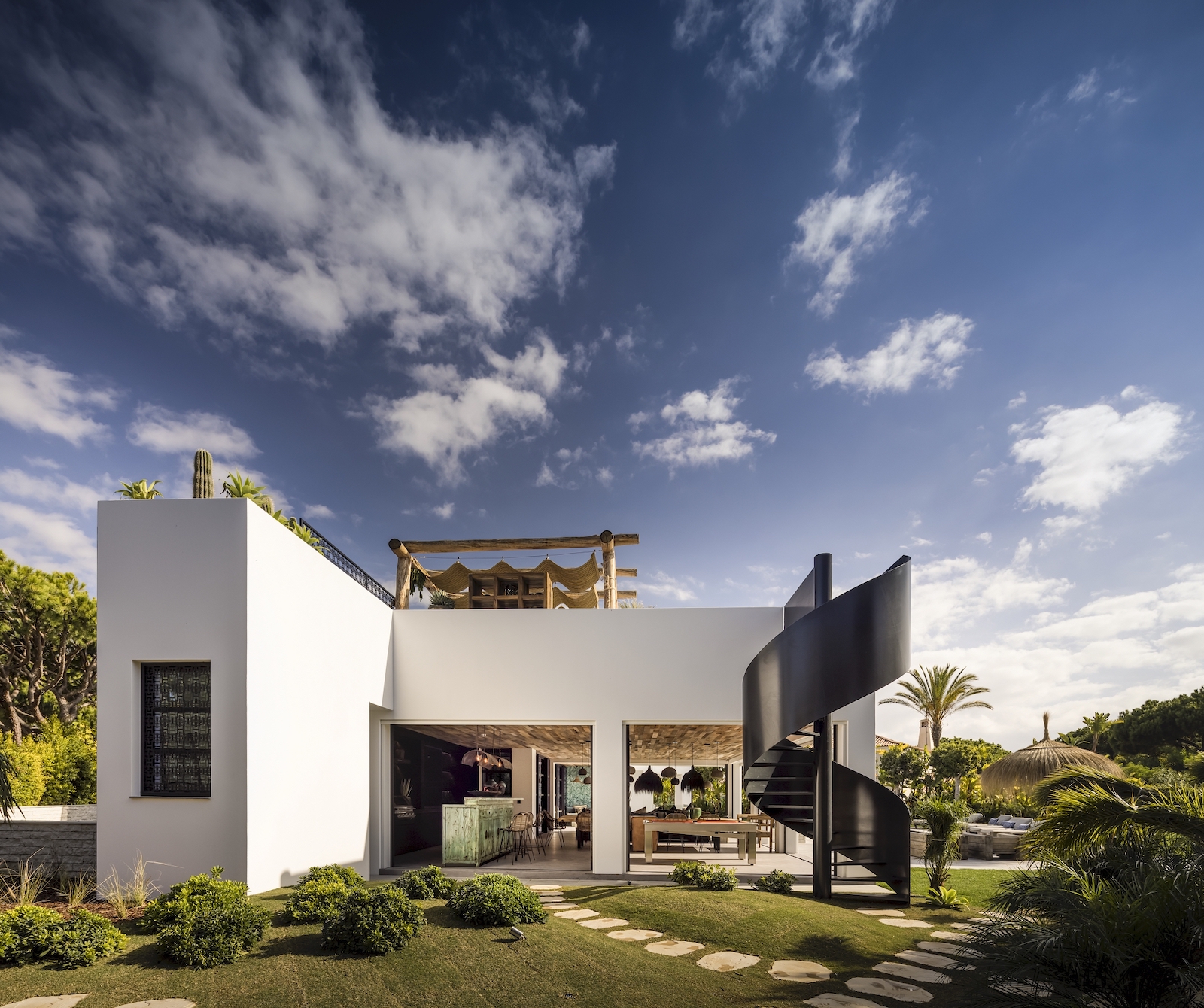 A covered terrace wraps around the property, as a space that connects the indoors and outdoors. The terrace can fully open up with large floor to ceiling doors, and can be closed for security when the holiday home is not in use.