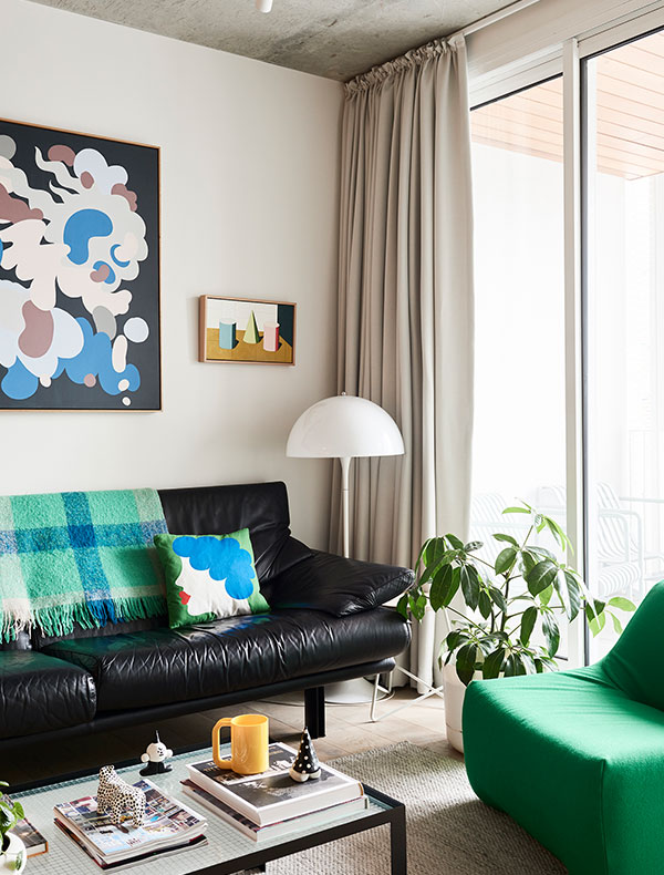 Samantha and David have been living in this building for almost two years now, and have happily settled in to their cheerful little slice of Fitzroy North. The couple love their building’s leafy central atrium, and note their apartment’s temperature-controlled interiors, which are especially important in summer. ‘We rarely put the air con on, so that’s been a blessing and for sure has saved us some cash!,’ says Samantha. ‘More gelati money!’