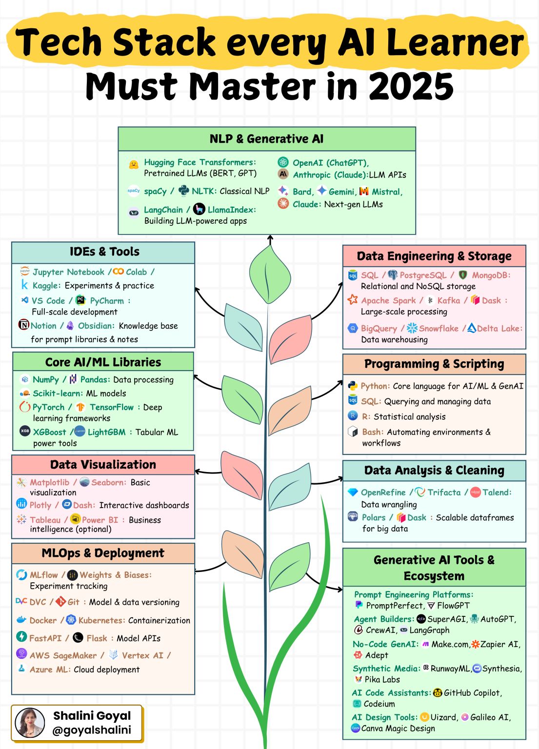 This weekend I created a complete roadmap for anyone to thrive in the world of AI, Machine Learning, and Generative AI. This guide outlines the key technologies, tools, and frameworks across 10… | Shalini Goyal