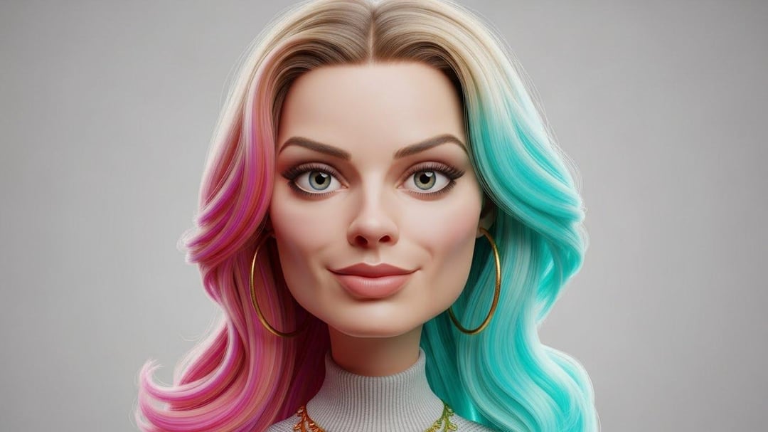A highly stylized 3D caricature of Margot Robbie, face-only close-up, featuring an oversized head, expressive facial features, and playful exaggeration. Smooth polished materials, soft ambient lighting, and a clean minimal background to keep full focus on the character. Give the character a random witty facial expression. Render whichever expression is selected as the primary emotion, making it look natural, charming, and full of personality. The primary color palette is dominated by deep red, vibrant blue, and electric green.