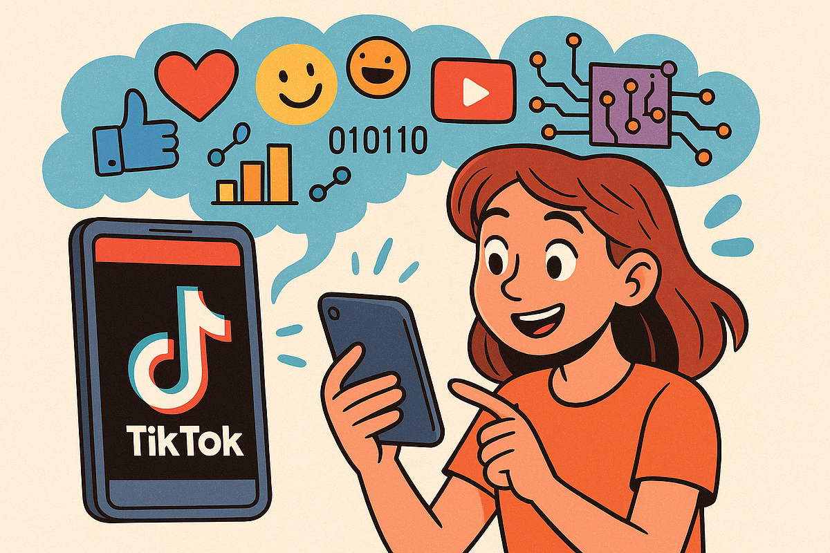 Cartoon-style illustration of a teenage girl smiling while scrolling on her smartphone. Around her float colorful icons like hearts, emojis, charts, binary numbers and circuit chips, symbolizing TikTok’s algorithm shaping her content feed.