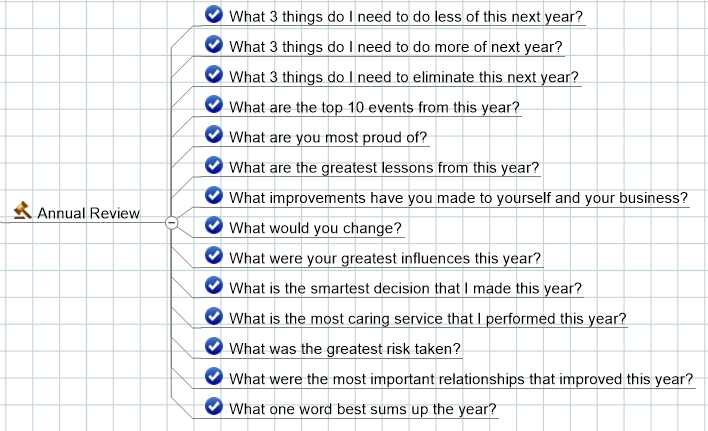 I have been doing a little reading and studying with a few gurus this month and 3 of them, John Maxwell, David Allen and Darren Hardy, had a lot to say about the annual review. The questions below are somewhat based on the list that Darren shares with his readers at Success Magazine.