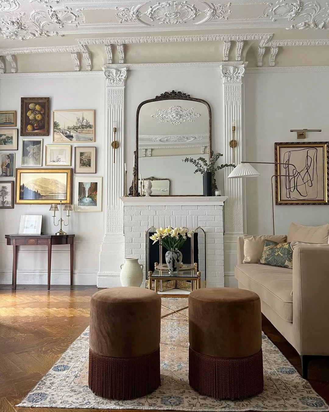 This space is a good example of layered decor. There are trendy pieces mixed in with antiques and classic elements, which help ensure the whole room won’t feel totally outdated in a few years.
