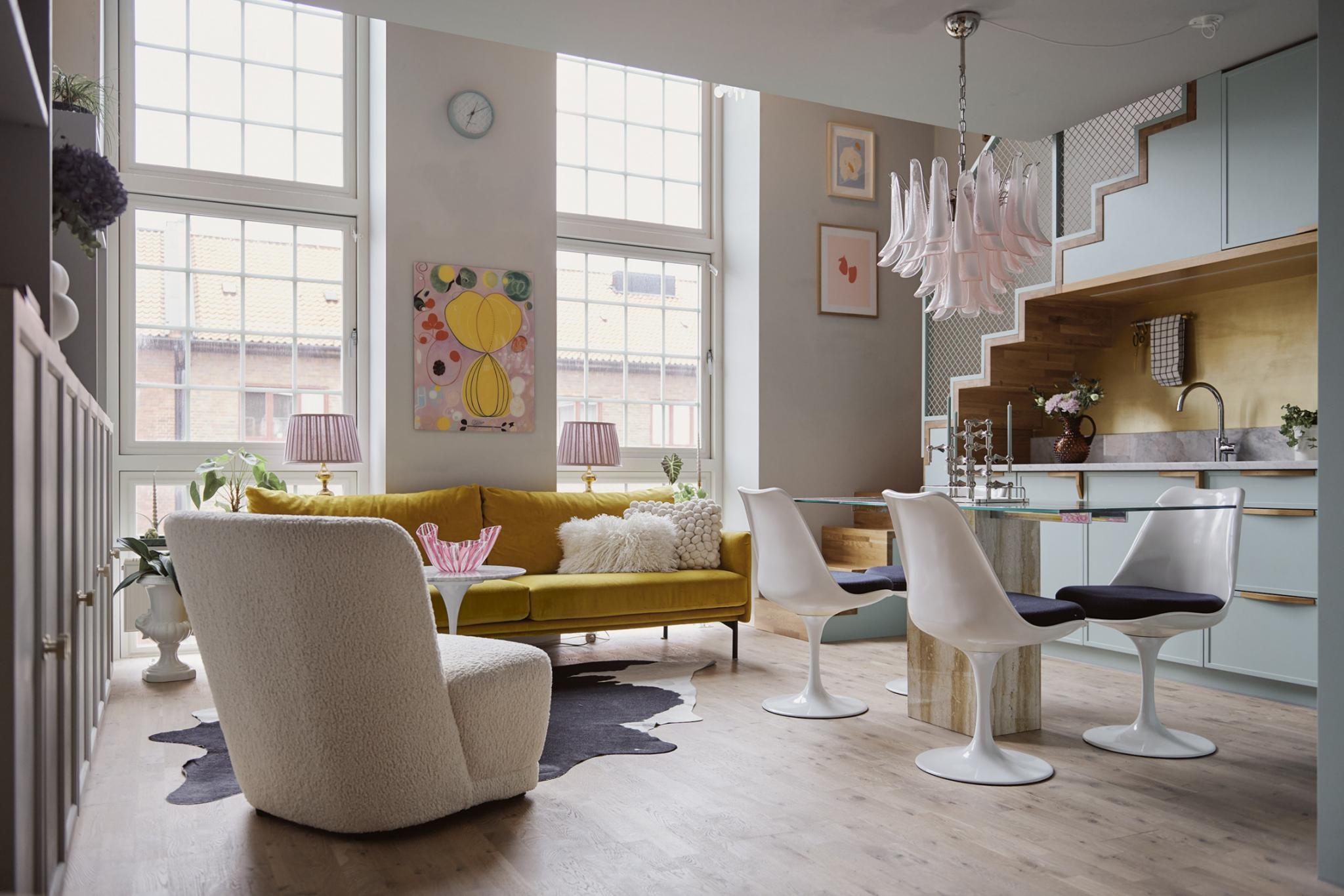 Next, think about the layout of the space. If you have a large window in the living room, opt for furniture that faces the window to maximize the natural light. Additionally, you may want to opt for a large dining table to help reflect the light and make the space brighter.