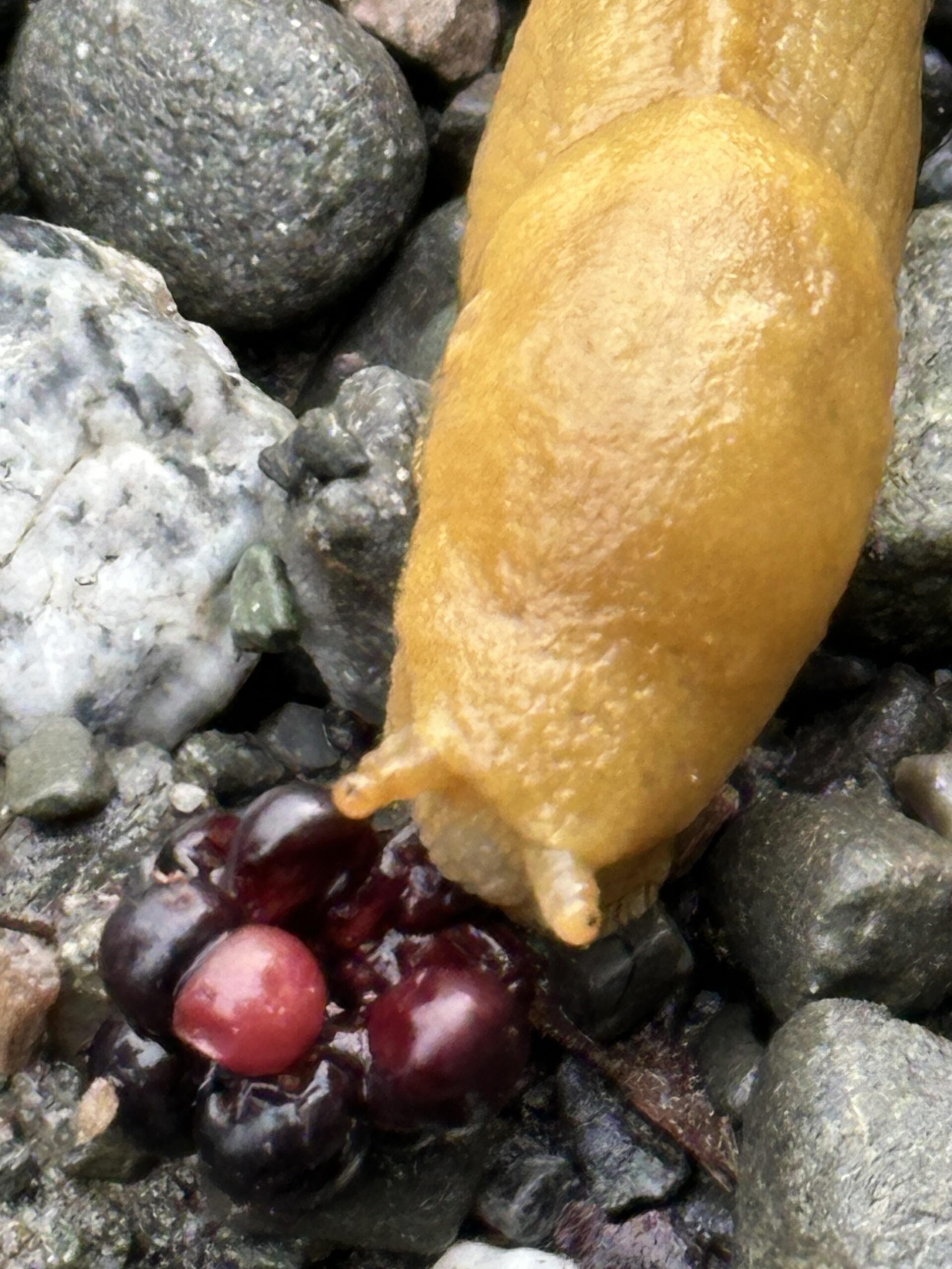 Tolstoy the Banana Slug! These beauties help keep the Redwoods alive and flourishing. They’ll eat anything except redwood seeds.this guy was hungry so I gave him a wild berry