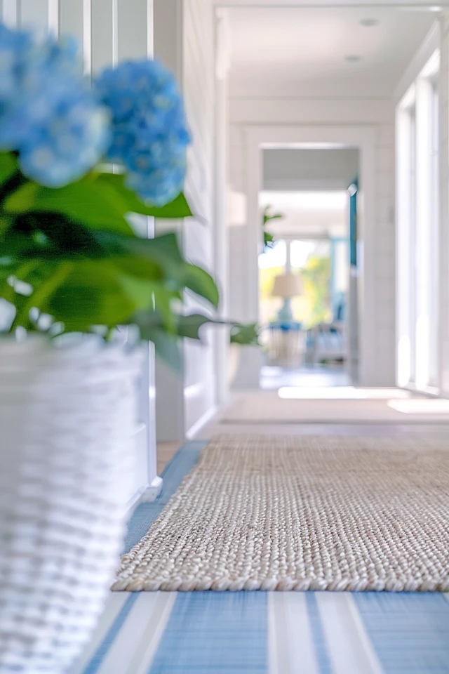 Additionally, consider incorporating natural materials like seagrass or sisal rugs in your beach house flooring. These organic fibers add texture and warmth while maintaining the light and airy vibe. A sisal rug with a bordered design can create a charming centerpiece in your living room or bedroom.