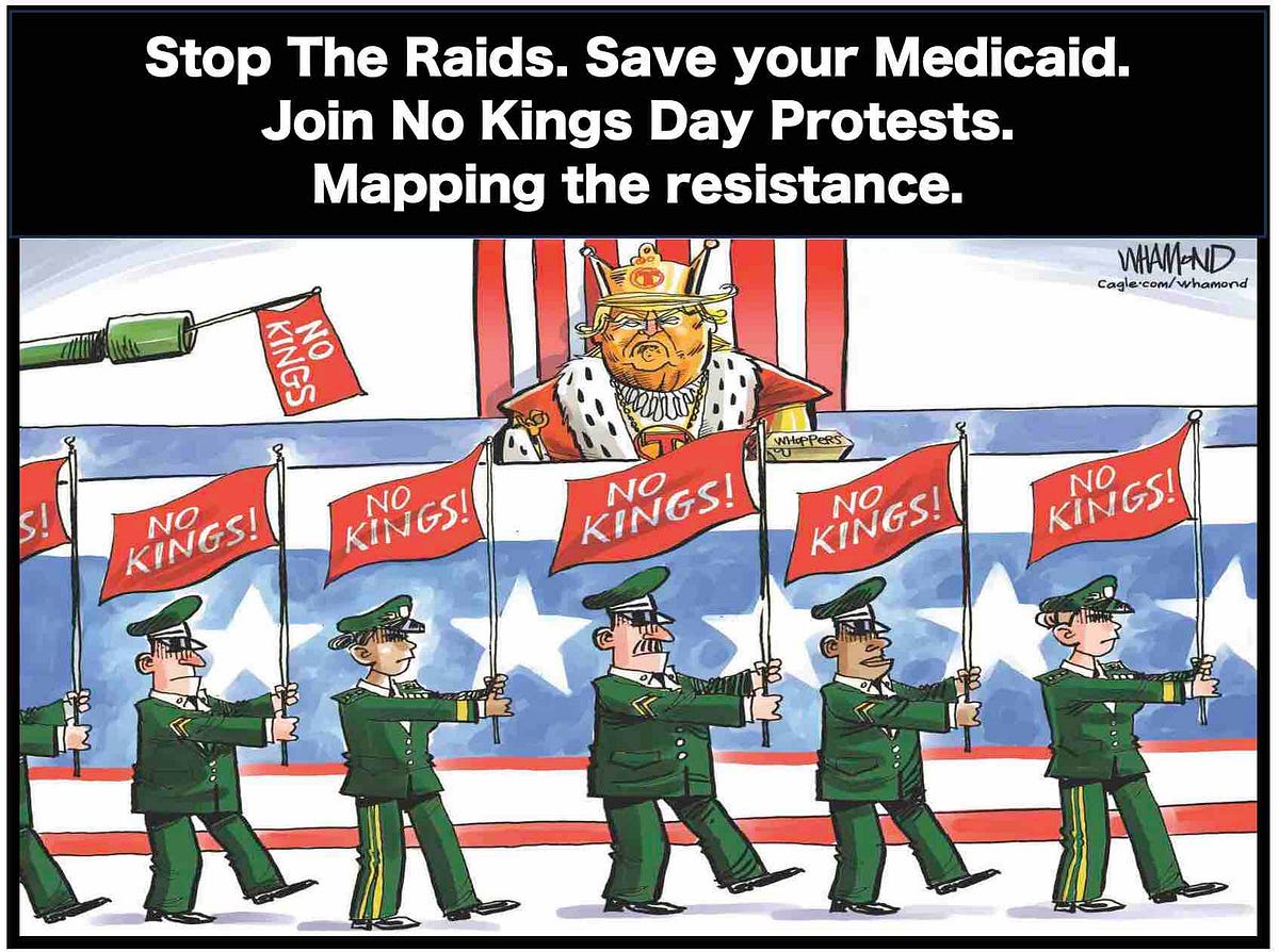 Follow the Medicaid cuts Republicans are push, ICE raids and join the NO KINGS DAY protests.
