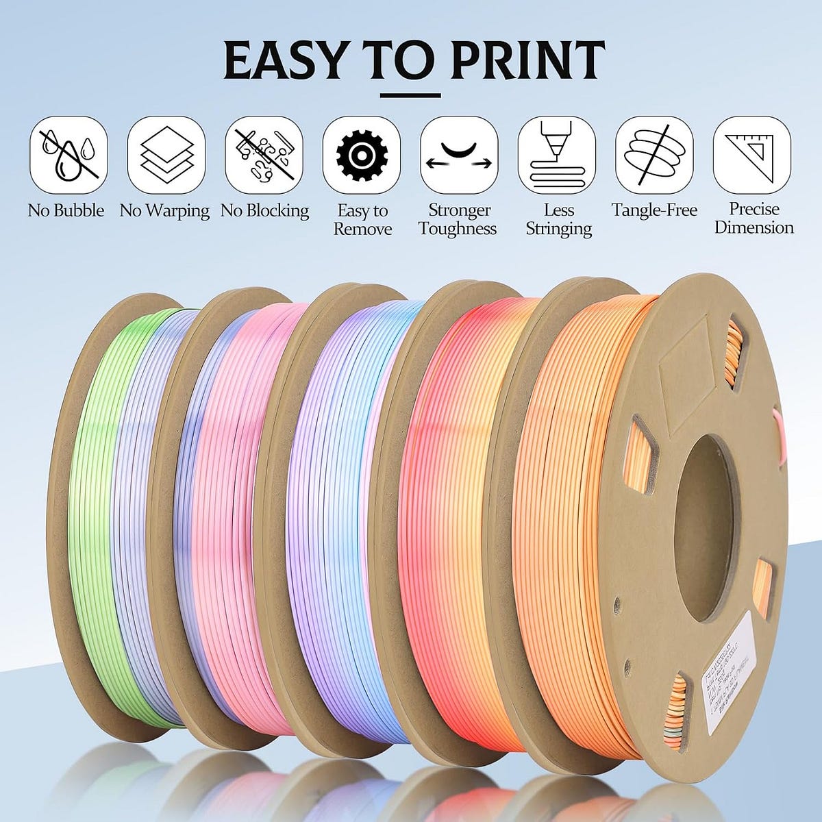 One of the standout characteristics of this filament set is its brilliant rainbow-colored silk finish. Unlike standard PLA filaments, the silk rainbow surface adds a lustrous sheen to prints, producing eye-catching results without needing post-processing. This effect is ideal for decorative items, prototypes, and artistic pieces where color variation and a glossy surface elevate the overall appeal.