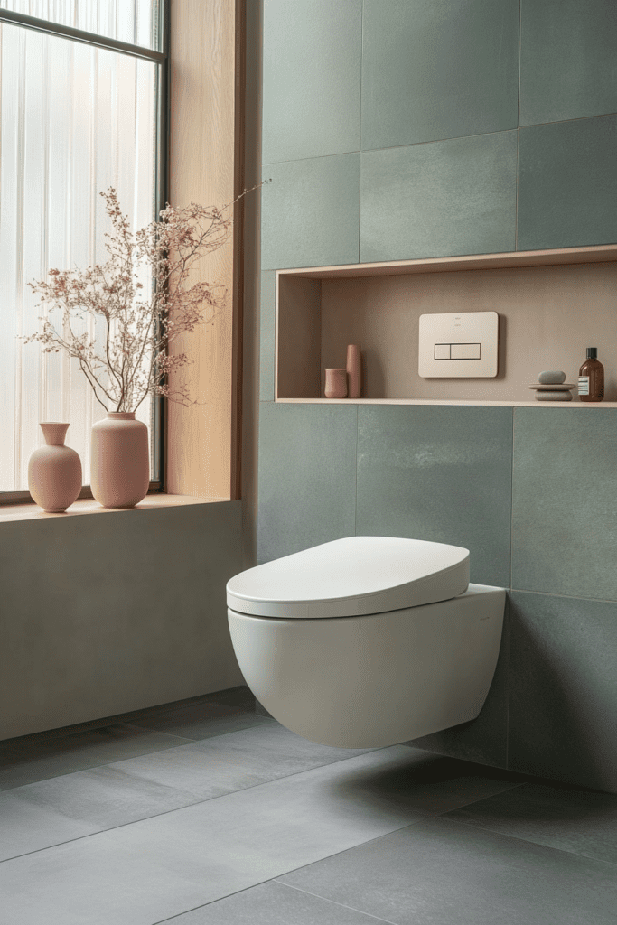 • Description: A minimalist toilet area with large, soft sage-green tiles, featuring a floating white toilet. The design is accented by a built-in shelf with pale pink framing and decor, complemented by matching vases on a windowsill.