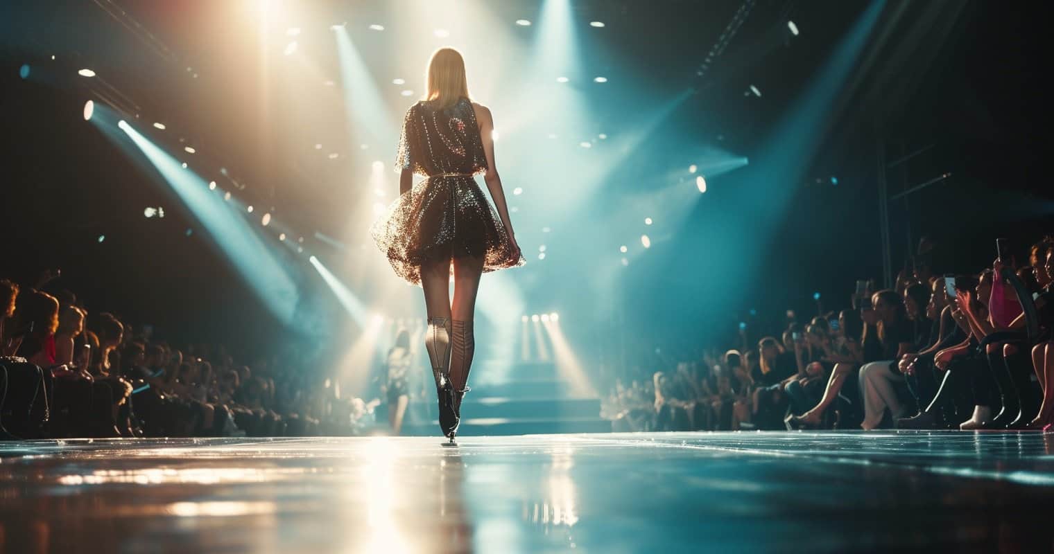 Wide-angle fashion show runway shot. Female model confidently striding down the catwalk. Chic, high-fashion ensemble, embodying the latest trends. The runway illuminated by stylish lighting, accentuating the outfit’s textures and colors. In the background, an enthusiastic crowd visible, capturing the vibrant energy of the fashion world. The scene is dynamic and glamorous, showcasing the excitement and elegance of the fashion show.