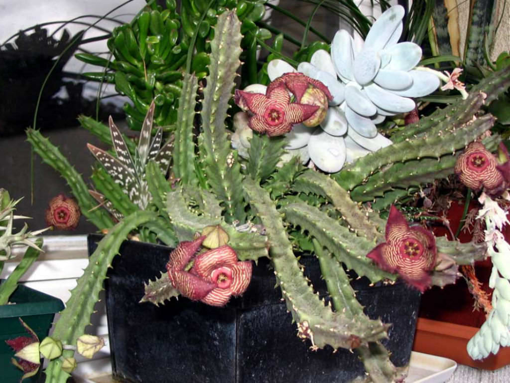 Stapeliads are relatively easy to grow. However, they should be treated as outdoor plants as they will easily rot indoors and cannot flower without exposure to outdoor temperature fluctuations. They should be grown under cover so that watering can be controlled. They require a reasonable amount of sunlight to promote flowering and maintain a well-shaped plant. Very shady positions will produce very poor flowering. Stapeliads come from climates where they survive extremely high temperatures in the summer months, so most growth is in spring and fall, with flowering in fall when the weather starts to cool down. In the growing season, water in moderation when needed, ensuring soil is fairly dried out between waterings. Do not water in winter.