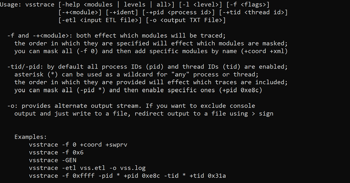The command vsstrace +f 0xffff -l 255 +indent -o log.txt runs VSS Tracing with full verbosity and captures all VSS activity into log.txt. The +indent option makes the output easier to read. We’ll demonstrate this throughout the blog. Start by running this command to begin tracing.